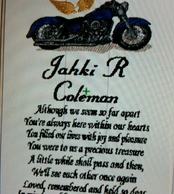 The memorial plaques can consist of poems, quotes, embroidered bike, cars. sport teams or any hobby representing your loved ones. The plaque sizes range from 5x7 thru 11X17